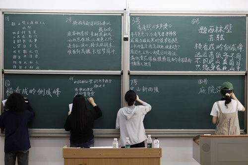 三笔字组比赛在5B306教室举办,涵盖硬笔字、软笔字、粉笔字三项内容,考查师范生书写技能。粉笔板书环节,选手四人一组上台书写,评委适时点评;软笔字环节,选手笔走龙蛇,展现书法之美;硬笔字环节,选手精准把握字体框架,彰显汉字魅力。最终,陈嘉晟、张景越获该组一等奖。朱思虎点评,三笔字是教师基本技能,希望学生能够坚持练习,将书法之美融入教学,进而夯实教学本领。
