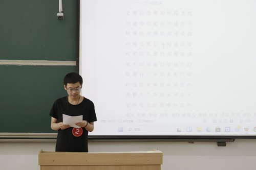 普通话组比赛在5B305教室进行,设朗读与即席演讲环节,考查师范生普通话水平与语言表达能力。选手韩淼森以“如何看待失败”为题发表即兴演讲,通过引用苏词“竹杖芒鞋轻胜马,谁怕?一蓑烟雨任平生”来证明“失败是新起点”这一论点。其演讲见解深刻、情感真挚,现场掌声不断。经多轮比拼,韩淼森获该组一等奖。