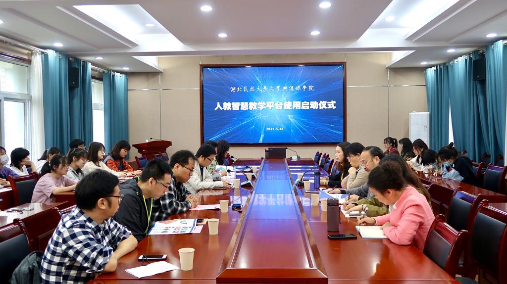 本网讯(记者 邢艺露)5月26日上午,人教智慧教学平台使用签约暨启动仪式在我院举行。文学与传媒学院院长罗翔宇、恩施州恒智教育科技公司总经理向宇、文学与传媒学院副院长何荣誉、校语委常务副主任郑艺、中文系教师代表及汉语言文学专业学生代表共计60余人参加仪式。