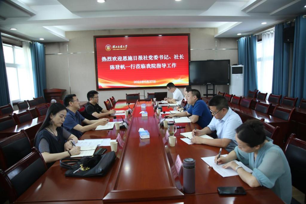 2023-06-27本网讯(记者 周琳)为了进一步落实好、开展好高校与新闻单位从业人员互聘交流工作。6月27日上午,恩施日报社党委书记、社长陈登帆、副社长沈祥辉、人力资源部主任黄彬一行莅临我院。我院院长张宏树、副院长刘进华、副院长江佳慧、办公室主任郑泽红、新闻传播系副主任谭苏、教学科张慧出席会议。会...