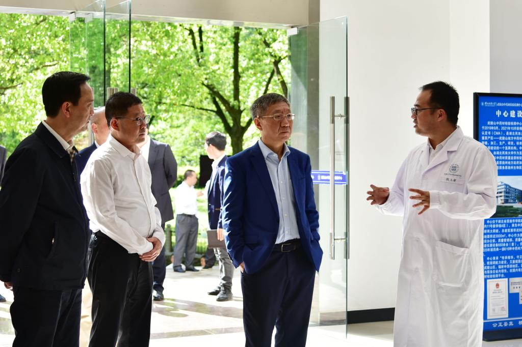杜耘(右二)在向前进(左一)、许强(左二)的陪同下考察武陵山中药材检验检测中心