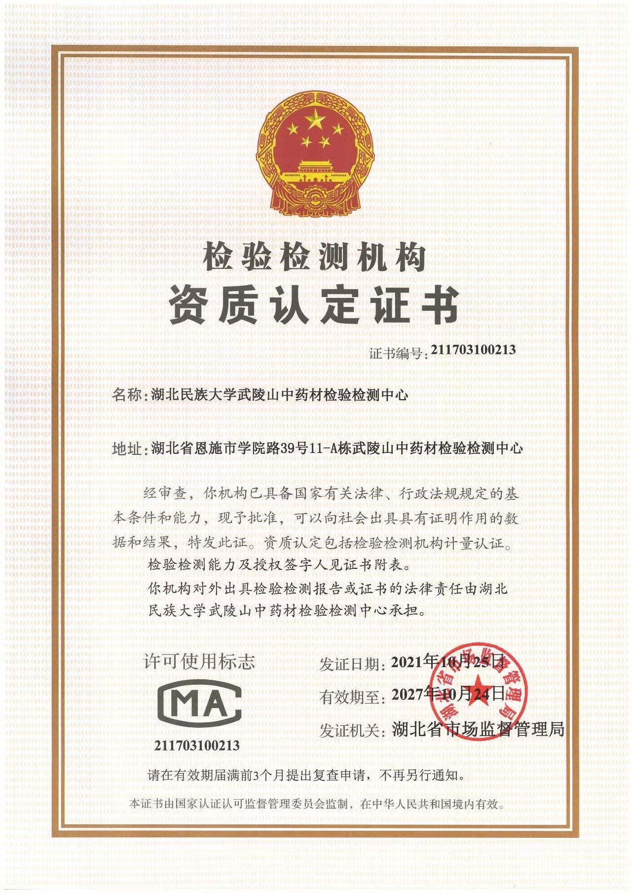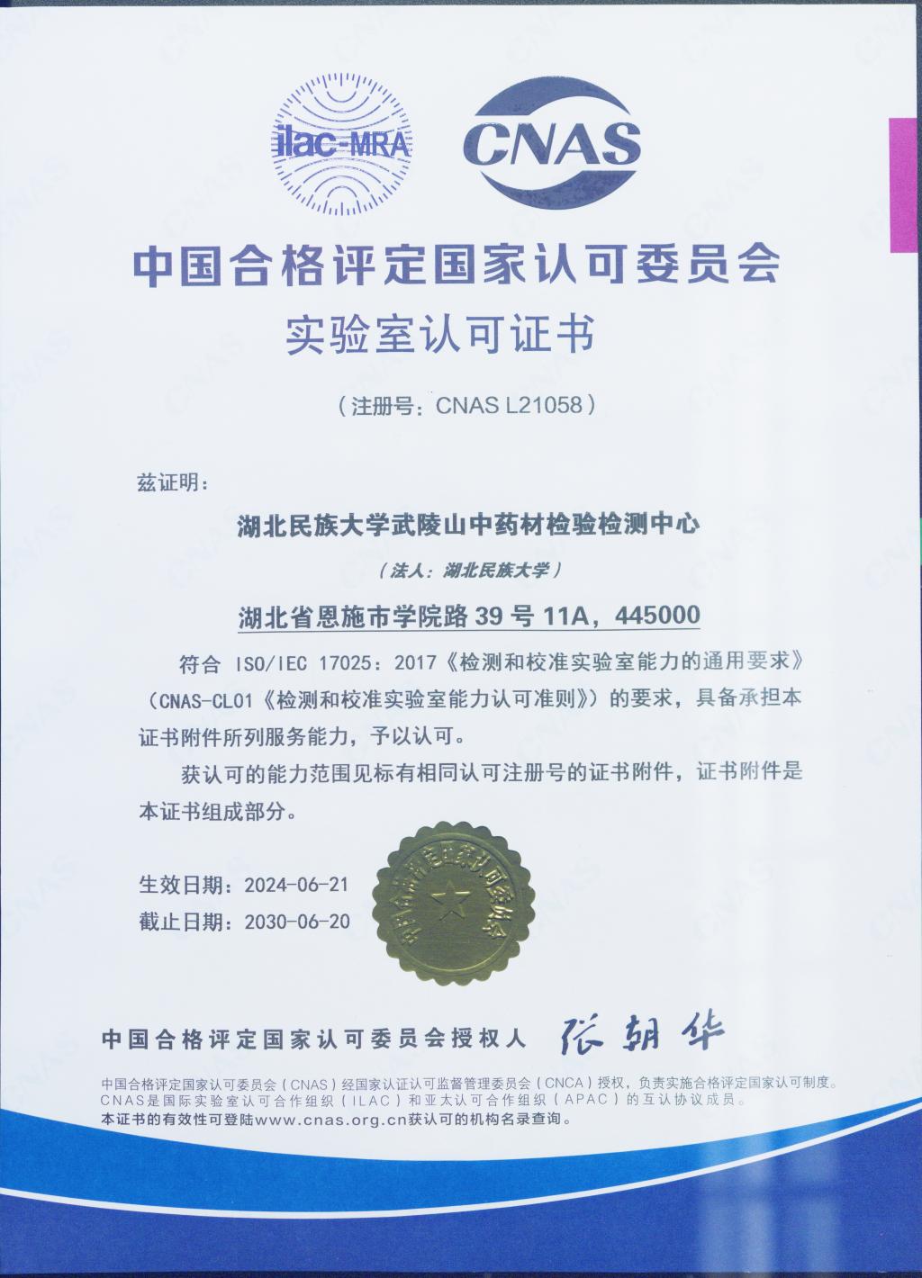 中心位于湖北省恩施市学院路39号(Beat365唯一官方网站校内11号教学楼A区),兼负中药材检验检测和中药材科研两大职能,总建筑面积近8000平方米,其中检验检测场地面积近3000平方米。中心于2021年10月获得检验检测机构资质认定证书(CMA),于2024年6月获得中国合格评定国家认可委员会认可证书(CNAS)。中心作为第三方检验检测机构,内设办公室、质量管理部、质量检测部和技术部,拥有先进仪器设备660余台(套),价值3000余万元,具备2020年版药典一部616种中药材产品、40项参数检测能力。