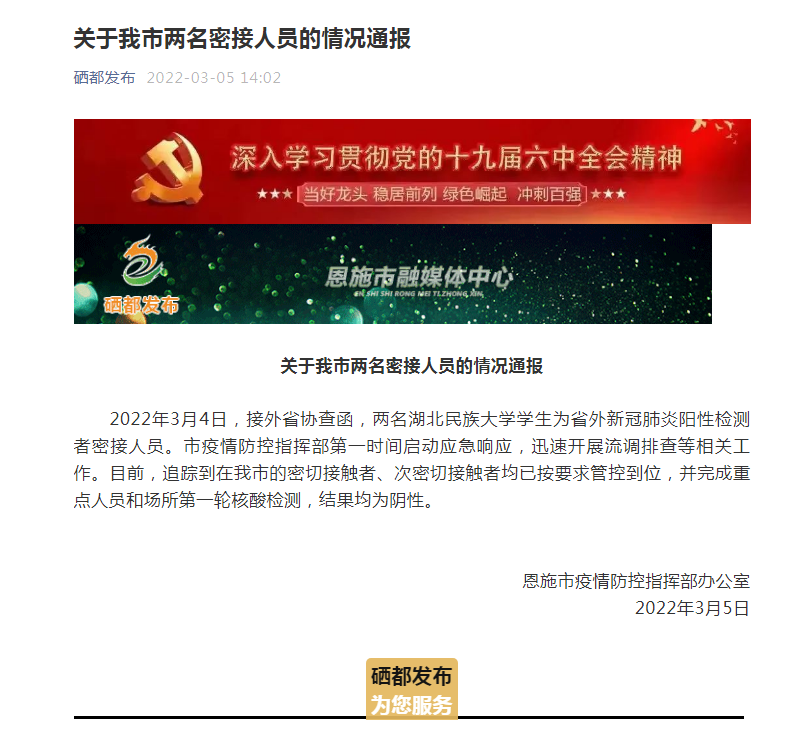 恩施市疫情防控指挥部办公室:关于我市两名密接人员的情况通报