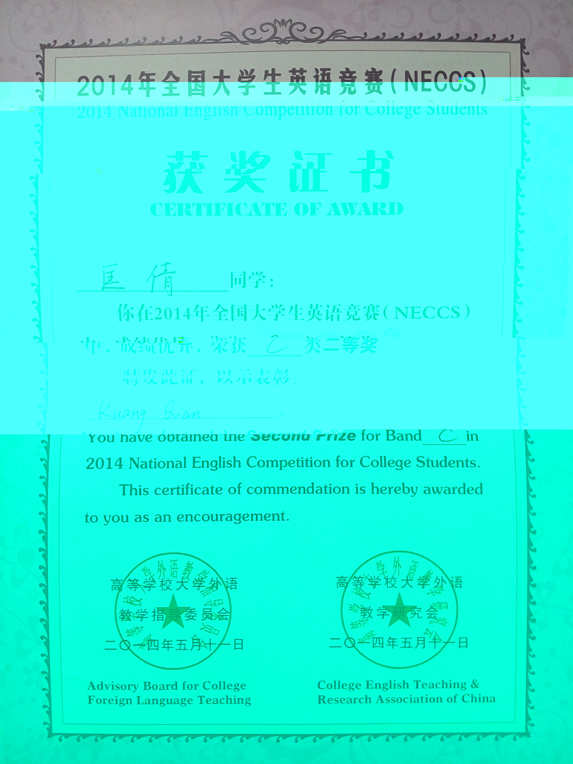 2014年全国大学生英语竞赛是由高等学校大学英语教学指导委员会及高等学校大学外语教学研究会联合举办的一次学科竞赛,在此次比赛中,中医药学生匡倩表现突出,成绩优异荣获C类二等奖。