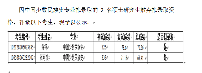 民族学与社会学学院2018年补录硕士研究生名单公示