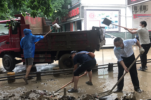 汛情就是命令,学校党员干部闻讯而动、向险而行、冲锋在前。17日下午,学校党员干部在栖凤社区龙洞河沿线的舞阳南区6、7、8栋逐户开展摸排和劝说工作,紧急疏散被困群众50余名。18日、19日,学校下沉桂花园社区的党员干部积极响应州委组织部、州直机关工委参与防汛救灾工作的部署,拿起铁锹、扫帚,紧急支援亲水走廊、九立方、市体育馆、机场路社区、栖凤社区、官坡社区等地的清淤工作。同时,学校党员干部还在栖凤社区龙洞河沿线开展巡河查堤、受灾统计、应急值守等工作。