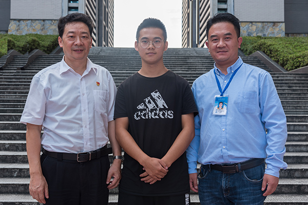 吴建清(左)与当日过生日的新生梁贤耀(中)合影留念