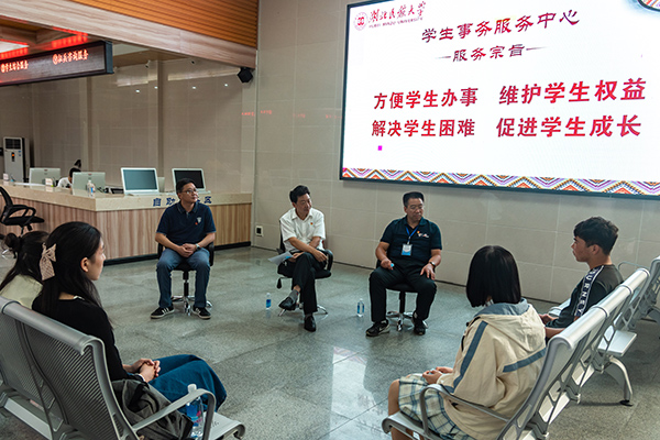 在大学生事务中心,吴建清了解了绿色通道工作情况,并与来自外国语学院、林学园艺学院、音乐舞蹈学院、教育学院、经济与管理学院的五名新生代表座谈,在听取五名同学的自我介绍以及对大学生活的规划设计以后,吴建清鼓励他们尽快适应大学生活,深入了解民大、融入民大,从民大校训和民大精神中汲取力量、坚定信心、磨砺意志、勤奋学习,在拼搏奋进中取得新的成绩。吴建清要求广大新同学要珍惜机遇、自强不息、追求卓越,铸牢中华民族共同体意识,在实现中华民族伟大复兴中国梦的伟大征程中成就人生理想、奉献青春力量、抒写灿烂篇章。在得知参加座谈的林学园艺学院梁贤耀同学当天刚好18岁生日之时,吴建清祝贺他生日快乐,并与他合影留念。