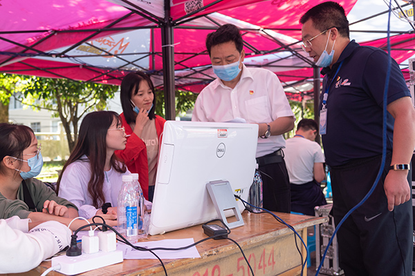 本网讯 (通讯员 武建鑫 赵梓强/图) 9月18日,学校党委书记吴建清在党(校)办、学工部(处)等单位负责人陪同下,来到大学生广场新生报到现场、新生宿舍和大学生事务中心看望2020级新同学,慰问迎新工作人员并了解迎新工作情况。