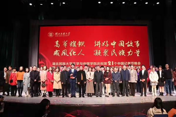 文学与传媒学院新闻传播系以及来自学校各媒体的近三百名师生通过歌舞、朗诵、情景剧、合唱等多种形式回顾我国新闻事业的发展历程,表达对新闻事业的真诚热爱和无悔追求,以及无惧艰难险阻,勇担责任和使命的壮志豪情。曾走上全国“好记者讲好故事”舞台的恩施日报社全媒体记者杜瑞芳与大学生们分享了她的记者故事《悬崖上的采访》。在利川市融媒体中心播音部主任叶仪的领诵下,出席活动的领导和师生齐诵习近平总书记提出的党的新闻舆论工作48字职责使命。