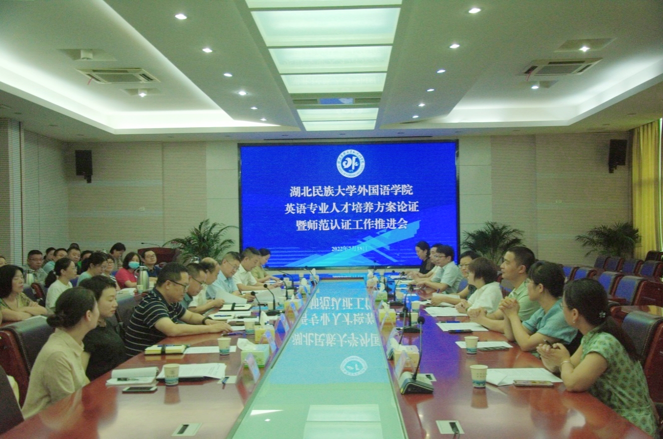 会议由外国语学院党总支书记严森主持,外国语学院领导班子成员、各科室负责人、英语系、商务英语系全体教师参加了会议。会议邀请恩施州教科院高中英语教研员廖海燕,恩施州英语教学指导委员会成员、恩施高中英语高级教师廖明妮,恩施市第一中学副校长、中学英语高级教师唐敦绪,恩施清江外国语学校副校长、中学英语高级教师谭志琼,恩施市第二中学英语教研组组长、中学英语高级教师张晓敏,恩施市三岔中学校长、中学英语高级教师谭家雄,舞阳中学英语高级教师李虹,恩施市实验小学英语高级教师蒋薇,学校教务处处长谭世明和教师教育学院院长谭华担任论证专家,对英语专业人才培养方案(2021版)进行现场论证与指导。与会专家对方案给予了高度评价,并围绕培养目标、毕业要求和课程设置等方面展开了热烈讨论,从不同角度提出了宝贵意见和建议。