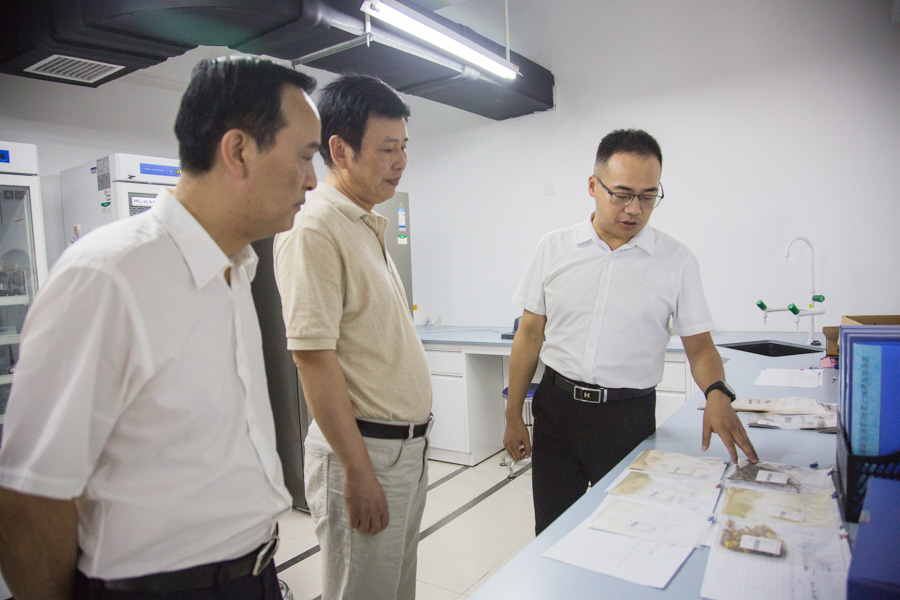 李社教(中)在向前进(左一)的陪同下参观武陵山中药材检验检测中心
