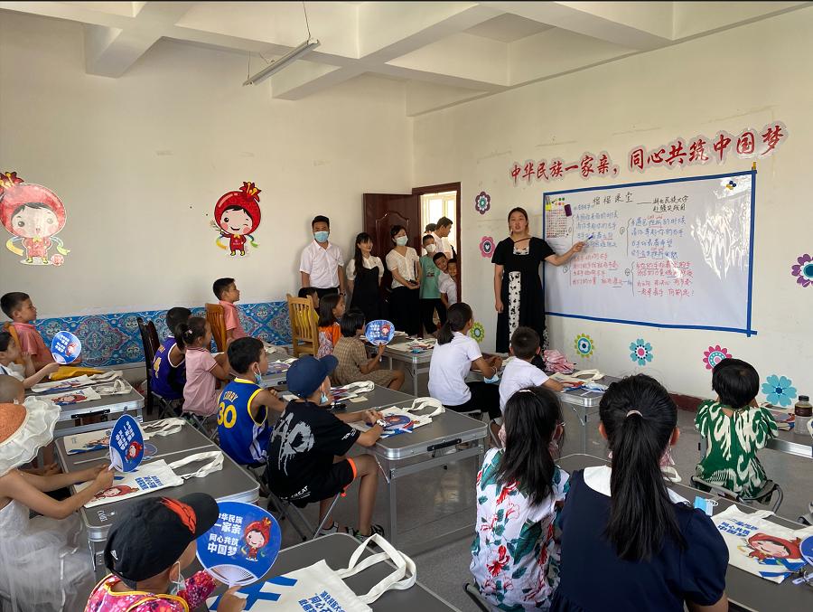 石榴花开,籽籽同心,让民族团结之花绽放在最美丽的地方。Beat365唯一官方网站“同心石榴”赴疆实践团远赴新疆,与新疆维吾尔自治区伊宁市墩买里街道办事处协海尔依其社区共建大学生志愿服务实践基地,团队成员在为期半个月的“大手拉小手”民族团结教育调研与实践中,与来自社区的不同民族的小朋友们共同学习中华文化、中华膳食、趣味中国字等知识。