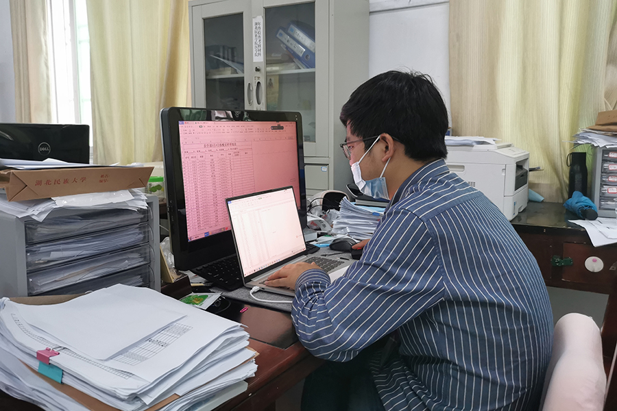 在每日核酸采样的前一天,周家頔老师总会逐一清点采样物资,并将其归类摆放好。翌日,医学部全体辅导员便在06:45之前,早早地在各自负责的采样点集合,在医学部党委常务副书记廖云的指挥下,共同维持队伍秩序、提醒学生保持一米间距、分发医疗物资、指导志愿者、通知班级排队、统计核酸采样数据等日常工作。在老师和志愿者们的默契配合下,医学部两千多人的核酸采样工作往往只需要两个小时就能完成。尽管如此,由于人数众多,医学部部分学生因支援前线被抽调而处于动态变化中,核酸采样的统计工作依旧面临着不小压力,为确保上报的数据真实准确,通过采取班级清点人数、班主任上报已采样人数与系统已扫码人数三者进行比对的方式,从而精确摸排到每一位学生的核酸采样情况,真正达到“应检尽检、不漏一人”的要求。