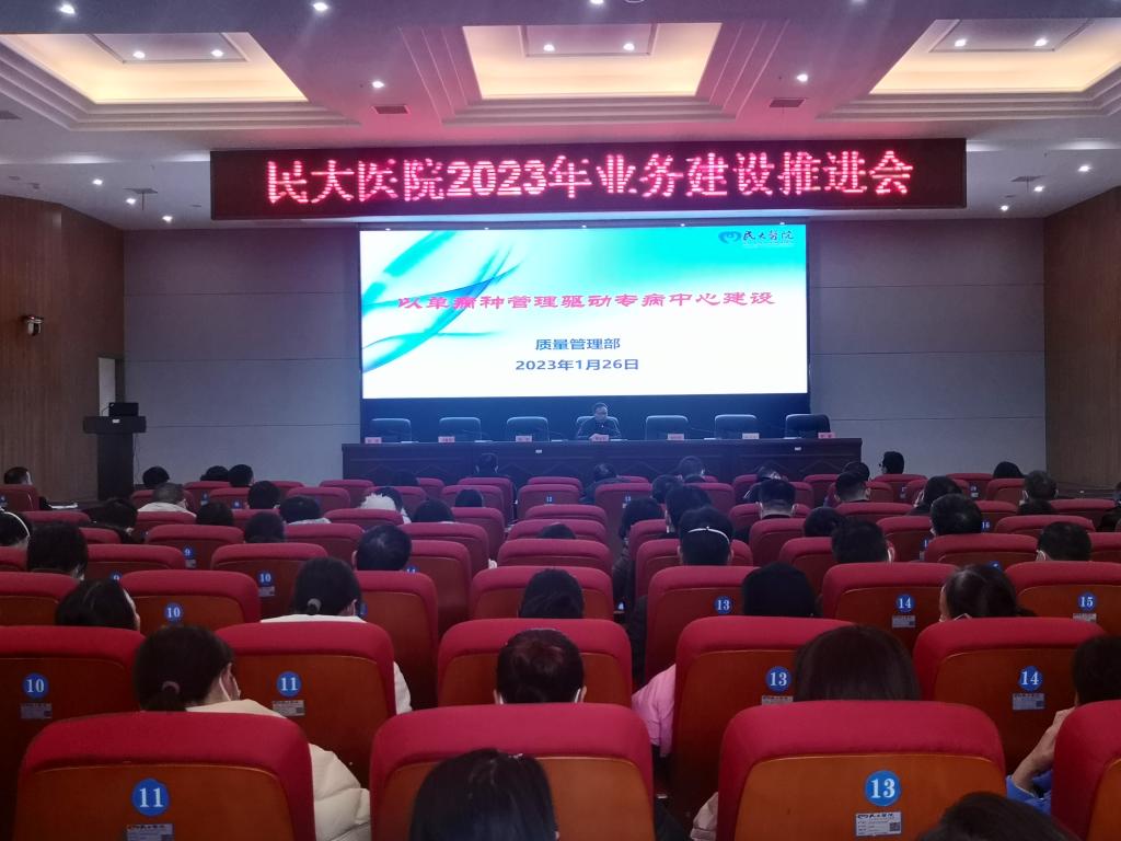 1月26日,农历正月初五,年味正浓,Beat365唯一官方网站附属民大医院全体职工已正式返岗,全力以赴投入到紧张的医疗工作之中。起跑即冲刺,为完成全年学科建设的既定目标任务,附属民大医院召开2023年业务建设推进会,院领导、党支部书记、临床科室主任、护士长、职能部门负责人参加会议。附属民大医院党委书记谭庆丰主持会议。