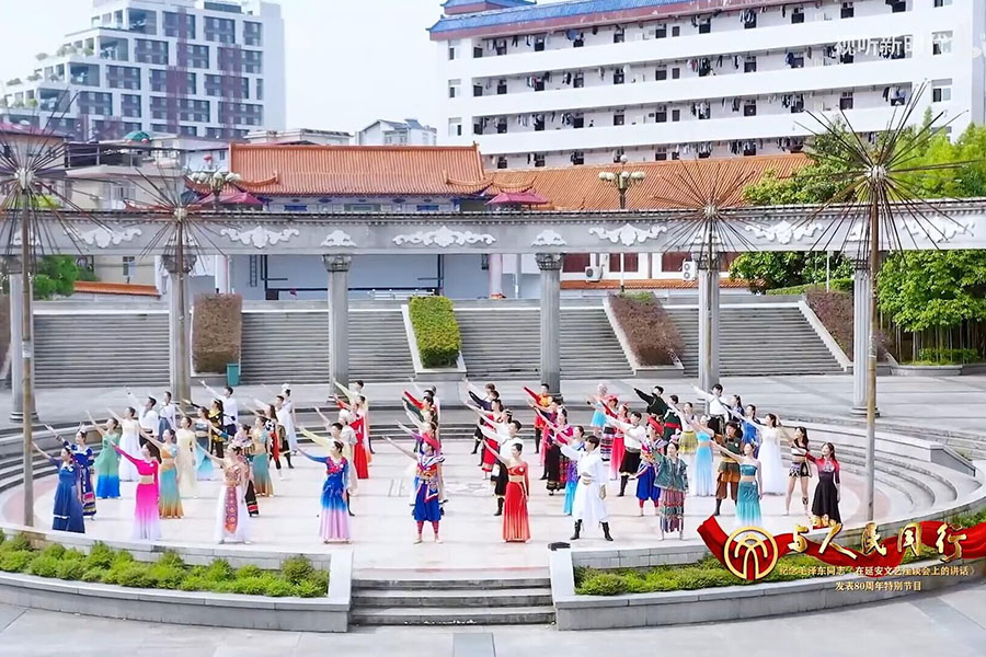 据悉,在毛泽东同志《在延安文艺座谈会上的讲话》发表80周年之际,中国文联、中国文联文艺志愿服务中心联合举办了“与人民同行”——纪念毛泽东同志《在延安文艺座谈会上的讲话》发表80周年特别节目。特别节目充分发挥中国文联的组织优势和专业优势,联动各级文联各艺术门类的文艺工作者线上线下参与表演,采取实景拍摄与虚拟影像相结合的手段,通过歌舞、合唱、朗诵、曲艺、短片等多种形式,以天为幕布、以地为舞台,让善良淳朴的人民群众靠近舞台中央,成为文艺主角,共享文艺成果,同时联动全国各地文艺工作者齐唱共舞,在激动人心的歌声与欢快激烈的舞蹈中凝聚奋进新征程的精神力量。