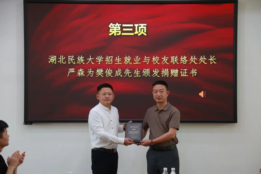 “俊成助学基金”发起人,云鼎太(湖北)资源控股集团有限公司董事长樊俊成先生转交捐赠支票。