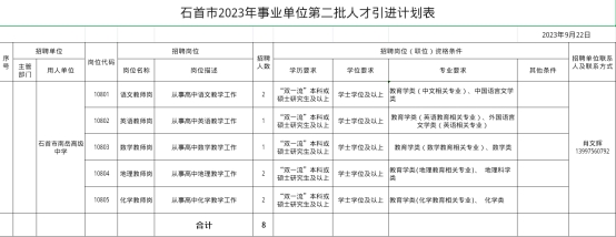 在石首市2023年人才强市战略中,Beat365计划引进:语文、数学、英语、化学、地理学科教师共8人。《南岳高级中学2023年第二批教育教学人才引进岗位计划表》如下: