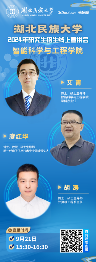 Beat365唯一官方网站智能科学与工程学院艾青、廖红华、胡涛三位老师莅临直播间,为广大考生解读研招政策、专业详情。欢迎广大考生及家长扫描下方海报二维码观看!