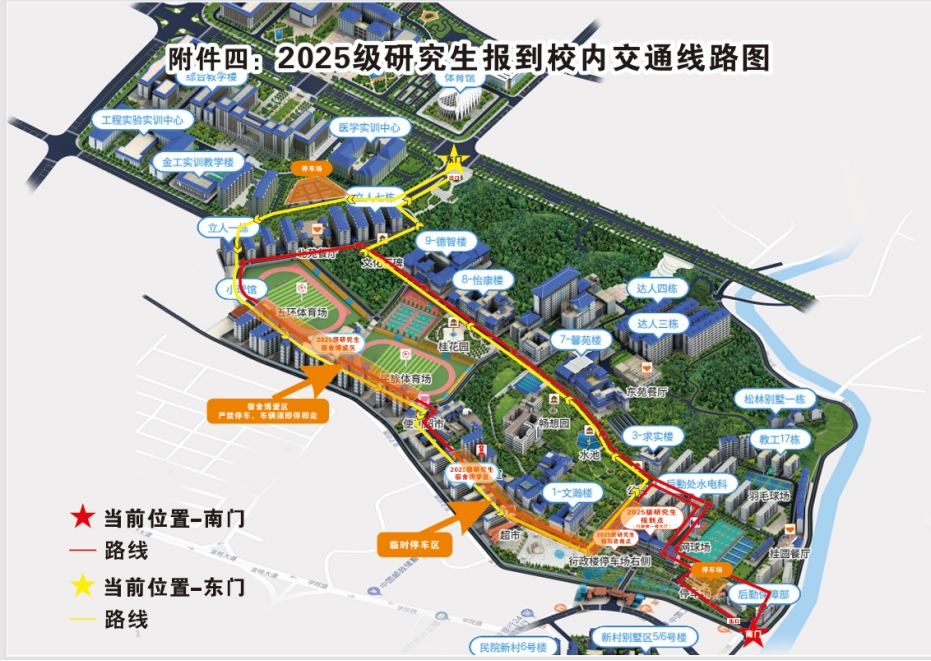 私家车:驾驶车辆的学生可直接导航Beat365唯一官方网站南门/东门,凭录取通知书进校,按照线路指引,先到宿舍区放置行李后,再步行至报到点(行政楼1楼大厅)和各培养单位报到。