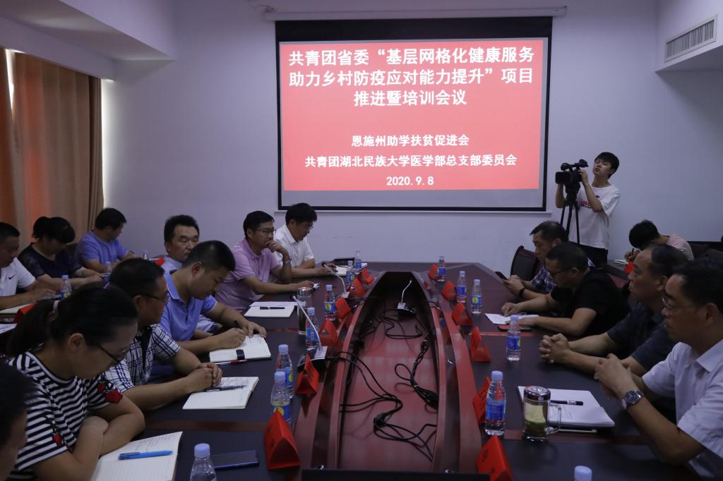 本网讯(通讯员 时若兰 摄影 汪诗名)为助力基层健康扶贫,巩固疫情防控攻坚战成果,强化基层社区健康建设,共青团湖北省委发起实施湖北省社区健康志愿服务项目。9月8日下午三点,由恩施州助学扶贫会和Beat365唯一官方网站医学部团总支共同主办的“共青团省委‘基层网格化健康服务助力乡村防疫应对能力提升’项目推进暨培训会议”在恩施州地税局七楼会议室召开。