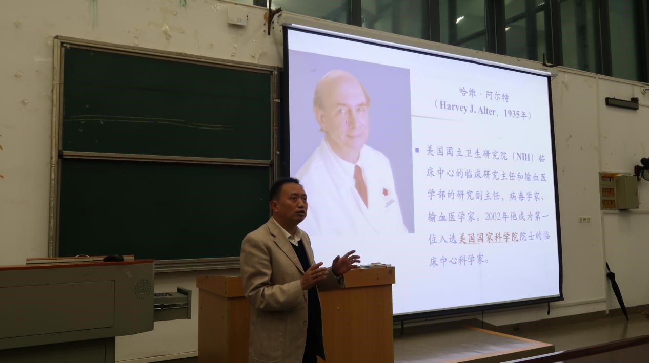 在活动过程中,罗教授首先介绍了2020年诺贝尔生理学或医学奖三位获奖者的个人简历和学术研究方向成果并简单地回溯了目前已发现的人类几种肝炎致病病毒的研究情况。然后对此次诺贝尔生理学奖或医学奖研究对象——丙肝病毒进行了详细介绍并重点阐述了三位研究者是如何发现该病毒及其发病机制并找到治疗其特效药物的完整研究历程,最后又引申到新冠病毒等其他人类致病病毒的研究,详细介绍了科研人员在对人类致病病毒的研究中从病毒的分子结构→致病机制→疫苗研制→药物研究以及防治原则等完整研究思路。罗教授还在报告中指出中国科学家是全世界最早发布新冠病毒的基因组序列,也是世界上最早提出新冠肺炎完整防治原则的国家并有效地指导了世界各国对该病的防治工作。从此次抗疫斗争中我们发现中国不论是在该烈性传染病的防控还是病毒疫苗的研制工作均走在了世界最前列,取得了重大突破和历史性的伟大胜利,值得每个中国人致敬。在此次报告的最后罗洪斌教授再次对全体研究生普及了新型冠状病毒的危害性,强调了遵守防治原则的重要性和必然性,并就防疫工作进行了有益的师生互动。