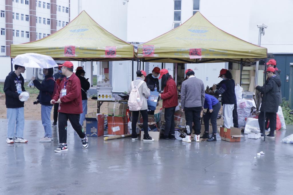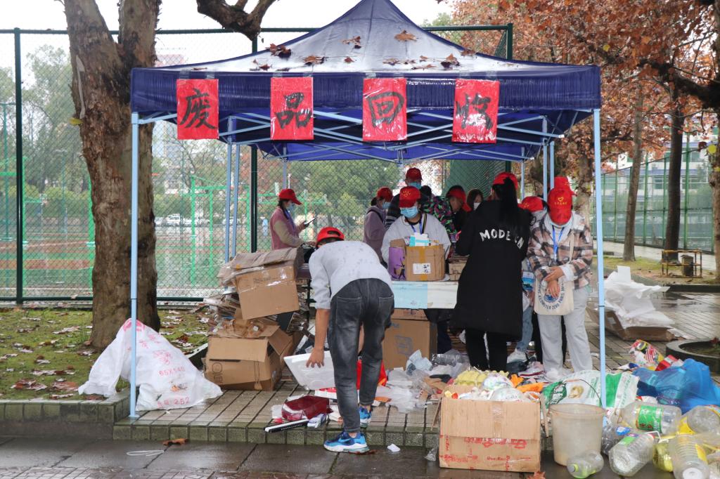 此次活动在学生宿舍楼、教职工宿舍楼、大学生广场分别设置回收站点,废品回收志愿者分组向全校师生收集可回收废品。
