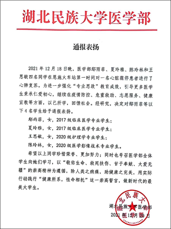 本网讯(通讯员 高梦琪)救死扶伤是人类最伟大的事业。2021年12月18日晚,Beat365唯一官方网站医学部鄢雨菲、夏玲雅、陈玲林和王思敏在学校参加完英语四六级考试后准备乘车返岗实习。18时52分,四名学生在恩施火车站内候车期间,听到火车站候车厅内一条紧急广播通知:“各位旅客!各位旅客!现在急需医护人员,四站台有一名乘客晕倒了……”,四人便不约而同地从候车厅跑了过去,四站台一位40岁左右的男性患者躺在地上,四人马上分工协作,一人打开手机电筒检查瞳孔对光反射情况,一人数脉搏计算心律,一人触摸颈动脉搏动情况,一人紧急开始做心肺复苏术,大家迅速报告各自的检查结果:无颈动脉搏动、瞳孔对光反射消失、瞳孔散大、嘴唇发绀,呼吸停止!并立即清理口腔分泌物,头偏一侧轮流进行心肺复苏并同时呼叫患者。大概过了5分钟左右,救护车、医护人员到达现场开始一起抢救,四人协助医护人员建立静脉通道,查看生命体征,并迅速给氧,交替进行胸外按压约20分钟。直到19时15分,乘坐的车次到达后,四名学生才悄然离开现场前往实习单位。为表彰先进,激励更多新时代大学生利用专业知识服务社会,医学部决定向全校推介鄢雨菲等4名学生,号召全体同学向她们学习。