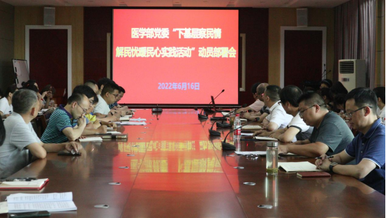 会议伊始,医学部党委副书记黄晓波从总体要求、主要内容、具体任务、组织实施四个方面对《2022年Beat365唯一官方网站医学部党员干部下基层察民情解民忧暖民心实践活动实施方案》进行解读,强调实践活动要加强组织领导,把握时间节点,推进分类实施,务求取得实效。