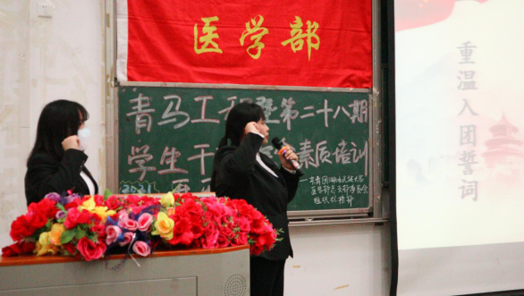 伴随着慷慨激昂的团歌,医学部第三期青年马克思主义者培养工程暨第二十八期学生干部综合素质培训班开课典礼正式开始。首先,由优秀团员代表张恬同学带领全体成员面向团旗庄严宣誓。接下来,由医学部团总支组织纪检部谢文菁同学宣读《医学部第三期青年马克思主义者培养工程培训班培养方案》,增进同学们对青马工程的了解。往期青年马克思主义者培养工程培训班优秀学员代表胡梦羽同学紧接着发言:青春是有限的,智慧是无限的,我们要以短暂的青春去学习无穷的智慧。鼓励同学们要努力奋斗,争做合格的青年马克思主义者。而后新生学员代表胡钊同学上台发言:作为青年学子,我们要自觉践行马克思主义,立志做坚定的马克思主义者,不断坚定马克思主义信仰和共产主义理想,切实把理想信念建立在对科学理论的理性认同上。