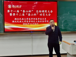 11月26日,医学影像技术专业第十一届“泰山杯”总结颁奖大会暨第十二届“泰山杯”动员大会于民大临床学院圆满举行,此次大会不仅是对过去一年辛勤耕耘成果的回顾,更是对未来征程的展望与动员。医学部副主任、医学技术系王松主任,医学部副主任陈磊,民大医院副院长冉瑞金,医学影像技术专业负责人向辉华,民大医院放射科技术组组长胡春阳,放射科乐敏莉、张华伍、杨早及医学部医学影像技术专任教师旷香琴参加了本次会议。参加本次会议的还有第十一届“泰山杯”参赛同学及医学影像技术专业22级全体同学,会议由民大医院教学科主任黎学兵主持。