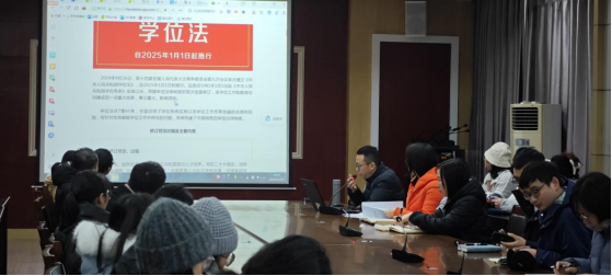 会上,全体师生对《中华人民共和国学位法》的背景和意义进行了深入了解。学习了《中华人民共和国学位法》的基本原则和制度、学位授予资格、学位授予条件、学位授予程序、学位质量保障等方面内容。深入领会了《中华人民共和国学位法》的精神内涵,并围绕高层次人才的分类培养和能力素质的提升等内容进行了交流讨论。
