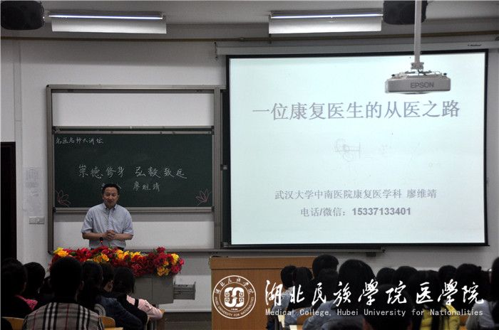 本网讯(通讯员 李晓芳/文 肖智仁/摄)5月11日,我院在修远楼5B208教室举办主题为“崇德修身,弘毅致远”的名医名师讲座。武汉大学医学部脑血管病研究中心副主任、主任医师、博士生导师廖维靖教授担任主讲人。讲座由我院副院长罗洪斌主持。