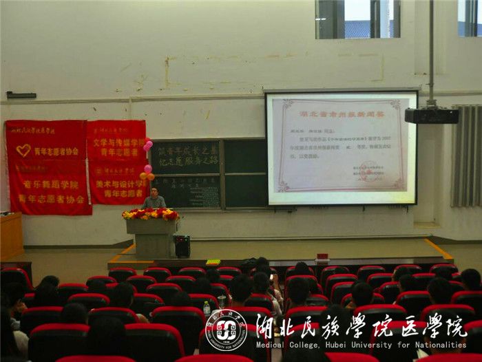 随后,周光兵老师以自己的切身经历,讲述了恩施州红十字志愿者服务总队的发展历程并详细介绍了志愿服务的形式、方法及目的。谈及自身献血经历,他坦然幽默地告诉同学们恋爱中的他是为了献血后的巧克力和玫瑰花。参加工作后通过对国家献血政策的了解,“一人献血,多人受益”的观念使他在今后坚持献血。周光兵指出,大学生是献血的主力军,但近年来有所减少,希望大家都发挥志愿服务精神,奉献自己力所能及的一份爱。