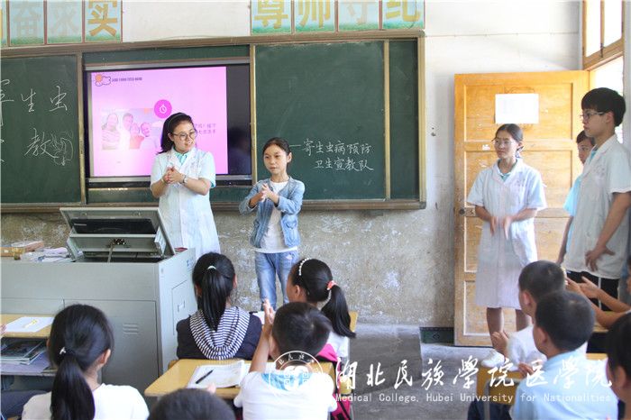 本网讯(记者 汪枫丽 张欢 朱丹/文 何艳霞/摄)为促进留守儿童的身心健康全面发展,6月20日-7月8日我院15级暑期社会实践团队《留守儿童寄生虫病防治卫生宣传队》以“留守儿童是否具有良好的卫生习惯及寄生虫病防治意识”为中心开展。本次活动由我院从事寄生虫教学及科研工作的何艳霞博士指导,分别在恩施州不同的三所小学进行,队长娜仁格日勒带领15级临床15班的8名成员参与本次活动。