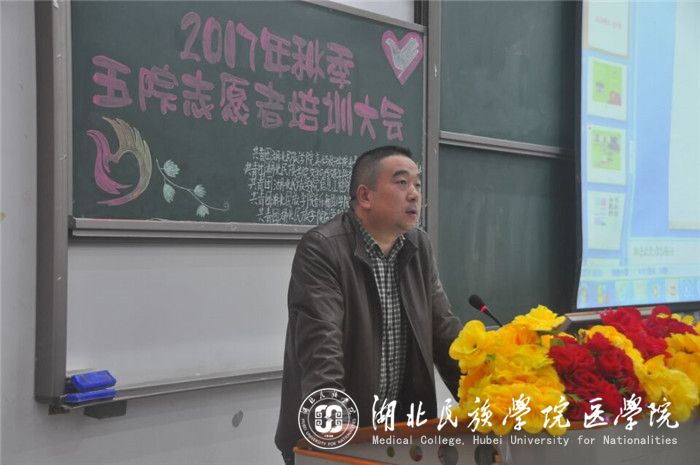 本网讯(记者 余秀/文 熊慧雯 吕丰旭/摄)11月17日,我院联合音乐舞蹈学院、文化与传媒学院、美术与设计学院、信息工程学院在修远楼5A207联合举办以“展青年奉献之采,扬志愿爱心之光”为主题的2017年秋季志愿者成立暨培训大会。恩施日报社恩施新闻网总编辑周光兵应邀出席本次培训,五个二级学院团委副书记及志愿者参加本次培训。