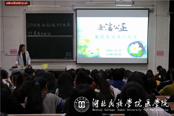 本网讯 (记者 向锦月/文 吕丰旭/摄)10月25日,我院学生党建工作委员会于医学院8206教室召开2018年秋季入党积极分子培训课,本次课程由我院党委副书记张蕊担任主讲人,我院入党积极分子及拟发展对象近200人聆听本次课程。