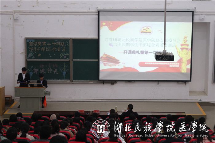 本网讯(记者 刘峻银/文 吕丰旭/摄)为提升我院学生干部的整体素质,11月5日,共青团湖北民族学院医学院总支部委员会组织纪检部于修远楼5A207教室举行我院第二十四期学生干部综合素质培训开课典礼。我院党委副书记张蕊、团总支书记张鼎、团总支常务副书记向涵莅临现场,我院三大组织及青年志愿者协会全体考核干事、18级全体班长和团支书共200余人参加本次培训。
