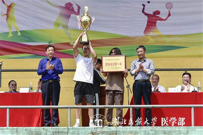 吴建清、顿祖义为获得团体总分第一名的医学部颁奖