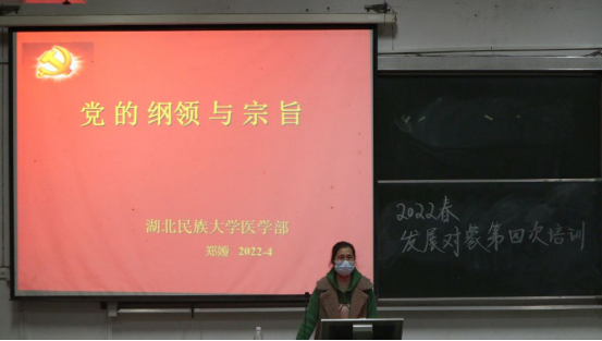 本网讯(通讯员 王伟 扶万里/文 黄太斌 罗英田/摄)为进一步加强对党员发展对象的理论武装和党性教育,4月17日晚上20:00,中共Beat365唯一官方网站医学部委员会2022年春季学期发展对象第四次培训课程于医学部8306教室召开,本次课程由我部郑娅教授担任主讲人,医学部全体发展对象参与本次培训课程。