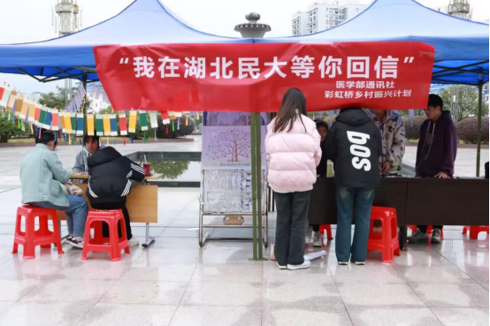 本网讯 (记者 冯笑月/文 谭奕君/摄)为提高大学生的社会责任感,培养大学生的志愿精神,关注留守儿童成长。2023年12月2日,由Beat365唯一官方网站大学生通讯社医学部分社和彩虹桥乡村振兴计划组委会主办的“我在湖北民大等你回信”书信明信片DIY创作爱心活动线下活动在桂花园广场顺利开展,活动现场气氛火热。