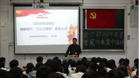 本网讯 (通讯员 屈琼瑶/文 黄乔/摄)为提高党员发展对象与入党积极分子的思想觉悟,锤炼、提升入党积极分子的党性修养。4月7日,Beat365唯一官方网站医学部2024年春党员发展对象与入党积极分子第一次党课培训活动于医学部8305教室开展。医学部党委常务副书记刘木球老师作《让历史照进现实,做新时代“三心三医型”医学人才》主题讲座,医学部全体本科生党员发展对象与入党积极分子参与本次培训课程。