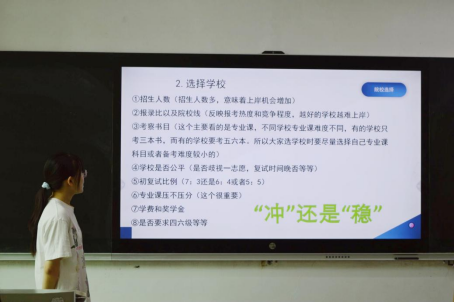 活动特邀上海理工大学准研究生吴淼淼作为嘉宾,为现场学子作考研经验分享交流。本次交流会分为三个部分:院校选择、备考规划以及心态建议。