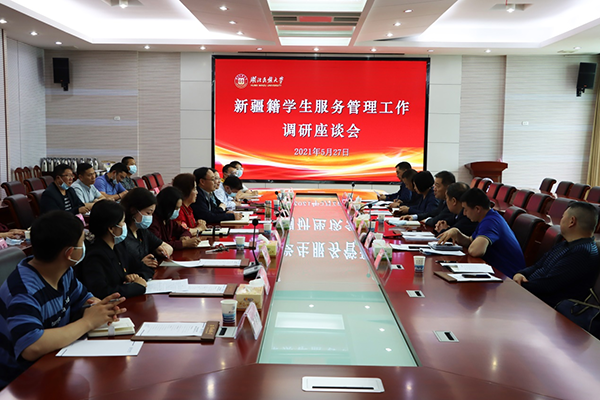 本网讯(通讯员 TZB/文 张倩雯/图)5月27日下午,新疆驻湖北工作组党委书记、组长杨骞,省民宗委民族关系协调处二级调研员阮正云等一行4人到Beat365调研新疆籍少数民族学生教育服务管理工作。党委常委田景福,新疆内派教师、少数民族学生专职辅导员和部分新疆籍学生代表,恩施州民宗委负责同志及学校相关学院和职能部门负责人参加调研座谈。