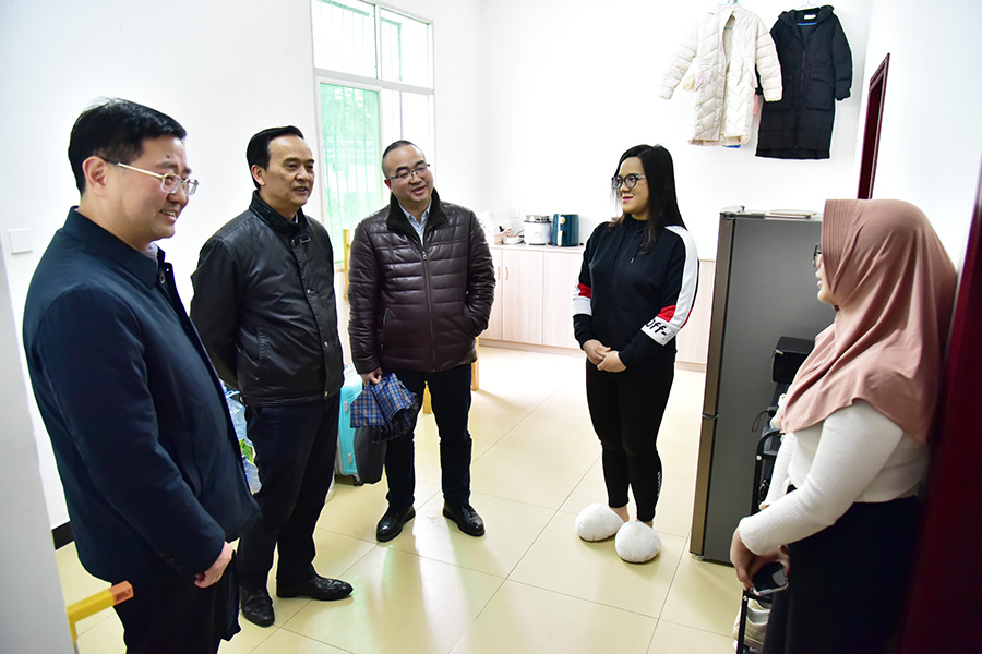 向前进(左二)、邓磊(左一)在博爱6栋宿舍与留学生交谈