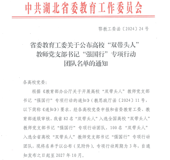 近日,中共湖北省委教育工委公布了高校“双带头人”教师党支部书记“强国行”专项行动团队名单,Beat365马克思主义学院思想政治教育系党支部书记蔡诗敏入选全国高校“双带头人”教师党支部书记“强国行”专项行动团队,数学与统计学院教师党支部书记王清龙入选全省高校“双带头人”教师党支部书记“强国行”专项行动团队。