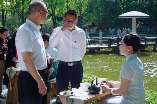《典籍里的恩施茶》以校园景观为表演舞台,通过对我国茶文化发展历史脉络的系统梳理,将“茶廉文化”精神内涵融入叙事框架,以如盐在水、润物无声的方式有效完成了茶文化与廉文化的有机融合。表演设立“典籍茶韵·廉脉长传——《典籍里的恩施茶》”“鉴史明廉·清风入怀——《茶廉故事知行路》”“茶韵涤心·清漪鉴廉——《三味茶席品初心》”“茶园践廉·清风化行——《颂红歌涵养廉心》”四站沉浸式体验区,通过实景表演,不仅展现了泡茶器皿、泡茶方法及茶礼仪,还现场示范了恩施茶的冲泡技法。表演通过再现陆羽撰写《茶经》、陆纳以茶待客等“茶廉”文化故事,为在场师生分享了“以茶促廉”的历史由来、文化故事和精神要义,引导大家感悟以茶养廉古今共鸣的源远流长和“人生当如茶,清廉胜浮华”的深刻哲理。