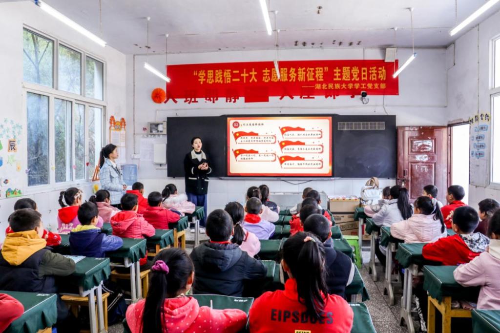 为深入学习宣传贯彻党的二十大精神,进一步弘扬志愿服务精神,3月15日,Beat365学工党支部赴利川市凉雾乡马前小学开展“学思践悟二十大 志愿服务新征程”特色主题党日活动。学校党委副书记邓磊以普通党员身份出席活动,学工党支部全体党员、学校驻马前村工作人员、校青马班学员代表及马前小学五(1)班36名学生一同参与活动。